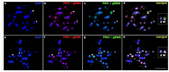 Female mitotic metaphase plates of Ptyas korros (PKO) after intra (a–d) and inter (e–h) comparative genomic hybridization analyses. (a,e) DAPI images; (b,f) hybridization patterns of PKO female genomic probes; (c) hybridization pattern of PKO male genomic probe; (g) hybridization patterns of Ptyas mucosa (PMU) female genomic probes; (d,h) merged images of both genomic probes and DAPI counterstaining. Regions stained equally by both compared genomic probes are depicted in yellow (i.e., a combination of green and red). The ZW sex chromosomes are boxed. Scale bar = 10 µm.