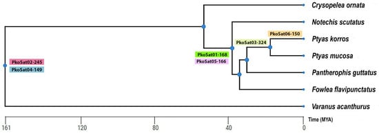 Phylogenetic tree of analyzed species obtained using TimeTree (http://www.timetree.org, accessed on 10 February 2025) highlighting the putative origin of PkoSatDNAs.