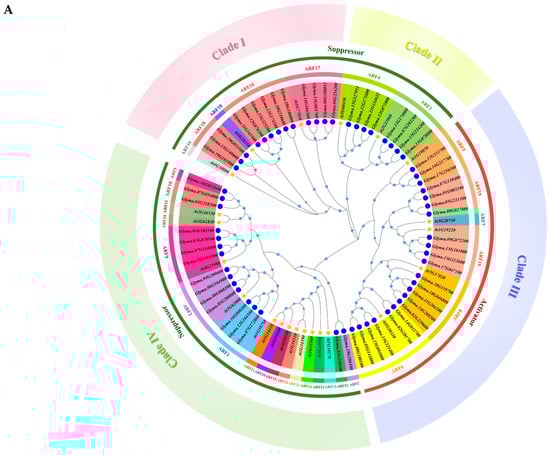 ARF is a key factor in auxin signaling transduction in plants, and this family plays a crucial role in plant growth and development. Initially, 51 members of the soybean ARF gene family were identified []. In this study, we conducted BLAST (ElasticBLAST 1.4.0) analysis in the new version of the soybean genome []. Our results suggest that there are 59 ARF gene members in the soybean genome (Figure 1A). Previous studies classified GmARF family members into five subclasses and three major branches []. In this study, using the updated GmARF protein members and amino acid sequences, our results suggested that GmARF family members could be divided into four subclasses and two major branches. Our results showed two branches were divided according to their potential functions, one branch belonging to the repressor subfamily and the other belonging to the activator subfamily (Figure 1A). Therefore, our phylogenetic tree analysis was more corelative with the potential protein functions. On the other hand, among the 59 soybean members, subfamilies ARF10, ARF16, ARF7, ARF11, ARF12, ARF13, ARF14, ARF15, ARF20, ARF21, and ARF22 in Arabidopsis thaliana are absent in soybean (Figure 1A) []. This phenomenon may be attributed to a significant subfamily preference in the distribution of the GmARF gene family, where soybeans in subclass II may be more inclined to retain or evolve specific subfamily genes. The missing subfamilies may have been lost due to natural selection, genetic drift, or other evolutionary events during soybean evolution [].