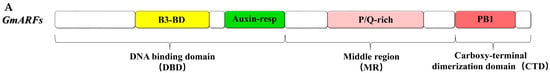 The gene structures of GmARFs. (A) The gene structures of the GmARFs include coding sequences (CDS) and untranslated regions (UTRs). (B) Distribution of protein domain of GmARF proteins.