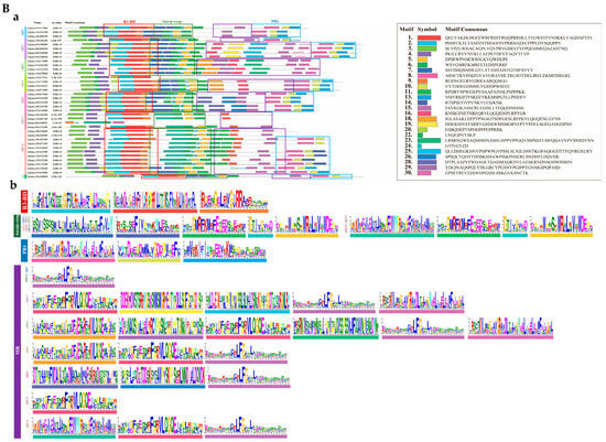 Furthermore, the online software MEME (http://meme-suite.org/tools/meme accessed on 27 November 2024) was utilized by inputting the amino acid sequences of the proteins []. The number of motifs prediction was set to 30, with lengths ranging from 10 to 50 amino acids. The resulting motif sequences were integrated based on information such as the position and score of each motif.
