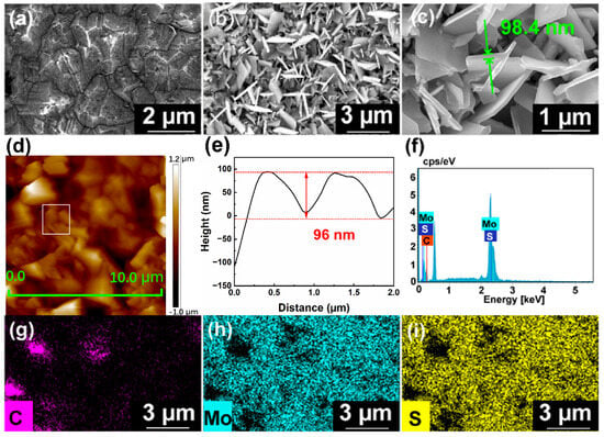 Figure 1a–c displays the morphological characteristics of the 2D n-MoS2 NSs with a size range of 1 to 3 μm. Compared to the p-light B-doped diamond film without twinning and with smoother crystallographic facets described in our previous work, the p-degenerated B-doped diamond films exhibit obvious twinned crystal characteristics. The twinned crystal and abundant grain boundaries of p-degenerated BDD films are beneficial in the nucleation of MoS2 NSs. The MoS2 NSs are densely and randomly distributed on p-DBDD film with a lateral size of about 1.1 μm and a thickness of 98.4 nm. The thickness of 96 nm obtained by local scanning with an atomic force microscope (AFM) confirmed the accuracy of the SEM results shown in Figure 1d,e. The 2D MoS2 NSs fixed on p-DBDD film show a uniform coverage and a large leakage boundary and specific surface area, indicating outstanding photoelectric detection advantages [30]. The element-mapping measurement of the MoS2 NSs was further confirmed according to the EDS mapping of the spectral area, as shown in Figure 1f. Our observations showed that the elements detected at the heterojunction are C, Mo, and S, as shown in Figure 1g–i which proves that the elements C, Mo, and S coexist and have a high purity. The above characterization proved the successful synthesis of the 2D MoS2 NSs on p-DBDD substrates, and no other peaks related to impurities were detected [31].