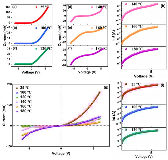 (a–g) I-V plots of n-MoS2 NSs/p-DBDD heterojunction at RT, 100 °C, 120 °C, 140 °C, 160 °C, and 180 °C. The inset in (a) shows the schematic diagram of the n-MoS2 NSs/p-DBDD heterojunction device. The inset in (b) shows the Ag/BDD/Ag and Ag/ITO/Ag ohmic contact. (h,i) lnI-V curves.