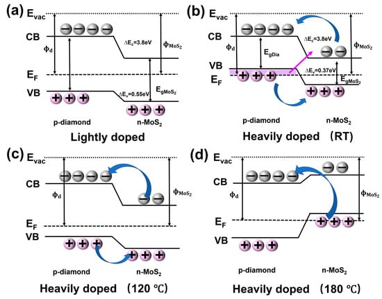 Energy band diagrams of (a) n-MoS2 NSs/p-non-degenerated BDD heterojunction at RT; n-MoS2 NSs/p-DBDD heterojunction at (b) RT, (c) 120 °C, (d) 180 °C.