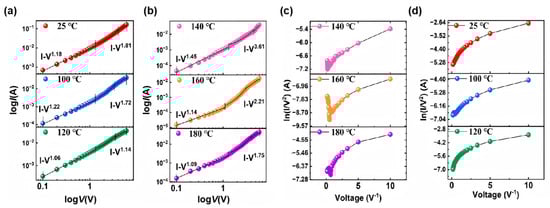 (a,b) logI-logV plots; (c,d) ln(I/V2) versus 1/V plots for n-MoS2 NSs/p-DBDD heterojunction from RT to 180 °C.