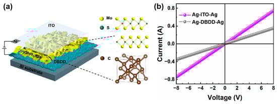 (a) The schematic structure of the n-MoS2 NSs/p-DBDD heterojunction. (b) The ohmic contact tests for Ag/ITO/Ag and Ag/DBDD/Ag.