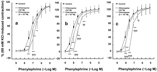 Effect of chloroquine on phenylephrine-induced contraction in endothelium-intact ((a), N = 6), and -denuded ((b), N = 6) aortas and endothelium-intact aortas pretreated with NW-nitro-L-arginine methyl ester (10−4 M, (c); N = 6, 6, and 5, indicating control, 10−5 M, and 3 × 10−5 M chloroquine, respectively). Data are shown as mean ± SD and expressed as the percentage of isotonic 60 mM KCl-induced contraction. N indicates the number of rats from whom isolated aortas were obtained. * p < 0.05, ** p < 0.01, and *** p < 0.001 versus control. † p < 0.05, †† p < 0.01, and ††† p < 0.001 versus 10−5 M chloroquine.