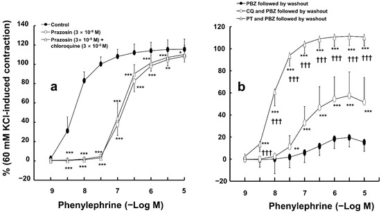 (a) Effect of prazosin alone and combined treatment with prazosin and chloroquine on phenylephrine-induced contraction in isolated endothelium-denuded rat aortas. Data (N = 6) are shown as mean ± SD and expressed as the percentage of isotonic 60 mM KCl-induced contraction. N indicates the number of rats from whom isolated aortas were obtained. * p < 0.05, ** p < 0.01, and *** p < 0.001 versus control. (b) Effects of pretreatment with phenoxybenzamine (PBZ, 5 × 10−8 M) alone followed by washout of PBZ with fresh Krebs solution (PBZ followed by washout), combined pretreatment with chloroquine (CQ, 3 × 10−5 M) and PBZ (5 × 10−8 M) followed by washout of CQ and PBZ with fresh Krebs solution (CQ and PBZ followed by washout), and combined pretreatment with phentolamine (PT, 10−6 M) and PBZ (5 × 10−8 M) followed by washout of PT and PBZ with fresh Krebs solution (PT and PBZ followed by washout) on phenylephrine-induced contraction in isolated endothelium-denuded aortas. Data (N = 10) are shown as mean ± SD and expressed as the percentage of isotonic 60 mM KCl-induced contraction. N indicates the number of rats from whom isolated aortas were obtained. ** p < 0.01 and *** p < 0.001 versus PBZ followed by washout. ††† p < 0.001 versus CQ and PBZ followed by washout.
