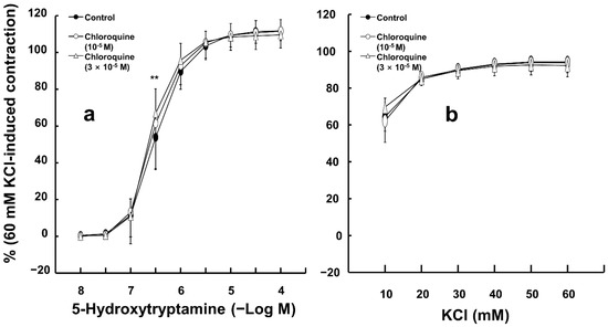 Effect of chloroquine on the contraction induced by 5-hydroxytryptamine ((a), N = 6) and KCl ((b), N = 5) in isolated endothelium-denuded rat aortas. Data are shown as mean ± SD and expressed as the percentage of isotonic 60 mM KCl-induced contraction. N indicates the number of rats from whom isolated aortas were obtained. ** p < 0.01 versus control.