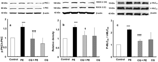 Effect of chloroquine (3 × 10−5 M, CQ) on phenylephrine (3 × 10−6 M, PE)-induced protein kinase C (PKC, (a), N = 5) phosphorylation, PE (10−6 M)-induced Rho-kinase (ROCK-2) membrane translocation ((b), N = 4). and PE (10−6 M)-induced myosin light-chain (MLC20, (c), N = 4) phosphorylation in rat aorta vascular smooth muscle cells. Data are shown as mean ± SD. N indicates the number of independent experiments. p-PKC: phosphorylated PKC; t-PKC: total PKC; ROCK-2 (M): ROCK-2 (membrane); ROCK-2 (C): ROCK-2 (cytosol); p-MLC20: phosphorylated MLC20; t-MLC20: total MLC20. *** p < 0.001 versus control. † p < 0.05 and ††† p < 0.001 versus PE alone.