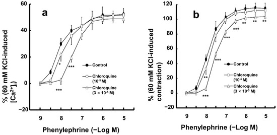 Low concentrations of chloroquine (10−5 M) inhibited the simultaneous intracellular calcium level ([Ca2+]i) increase and contraction induced by only 10−8 M phenylephrine (Figure 5a,b; [Ca2+]i: p < 0.05 versus control; contraction: p < 0.01 versus control). Furthermore, a high concentration of chloroquine (3 × 10−5 M) inhibited the [Ca2+]i increase induced by a narrow range of phenylephrine (10−8 and 3 × 10−8 M), whereas it inhibited the contraction induced by a wide range of phenylephrine (10−8 to 10−5 M) (Figure 5a,b; [Ca2+]i: p < 0.001 versus control at 10−8 and 3 × 10−8 M; contraction: p < 0.01 versus control at 10−8 to 10−5 M; Figure 6).