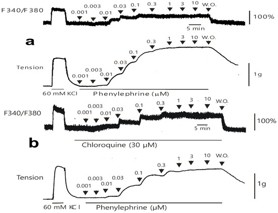 [Ca2+]i was assessed using the fluorescent calcium indicator Fura-2, following the method outlined in a previous study [24,25]. Rat aortic muscle strips were incubated with 5 µM Fura-2 acetoxymethyl ester (fura-2/AM) and 0.02% Cremophor EL for 5–6 h at room temperature. Subsequently, the muscle strips were rinsed with a physiological salt solution at 37 °C for 20 min to eliminate any unhydrolyzed fura-2/AM and placed horizontally in a 7 mL organ bath maintained at a controlled temperature (37 °C). One end of the muscle strip was attached to a force–displacement transducer to record muscle contractions. Muscle strips were alternately illuminated at two excitation wavelengths (340 and 380 nm) at 48 Hz. Fluorescence intensity at 500 nm (F340/F380) was measured using a fluorometer (CAF-100, Jasco, Tokyo, Japan). The F340/F380 ratio was used to assess [Ca2+]i. The precise intracellular calcium concentration could not be determined because the dissociation constant of the calcium fluorescence indicator in the cytosol may differ from that obtained in vitro. Therefore, the F340/F380 ratios measured during resting conditions and after 60 mM KCl-induced contraction were considered 0% and 100%, respectively. The F340/F380 ratio and isometric contractions were captured using a PowerLab/400 system with the Chart program (MLT050; AD Instruments, Colorado Springs, CO, USA). The muscle strips were set under an initial resting tension of 29.4 mN for 30 min. Each experimental protocol used strips obtained from the same rat. Following the treatment of aortic strips with chloroquine (10−5, 3 × 10−5 M) alone for 10 min, simultaneous measurements of [Ca2+]i and tension were obtained by gradually adding phenylephrine (10−9 to 10−5 M) to the organ bath, either with or without chloroquine.