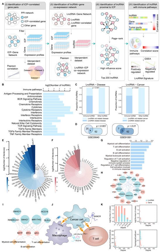 Overview of a computational framework for identifying ICP-related lncRNAs. (A) Schematic illustration of four steps for the identification of ICP-related lncRNAs. (B) The number of lncRNAs in immune-related pathways. (C) The validation of immune-related lncRNAs in various databases. The figure on the left shows the validation of immune-related lncRNAs in the LncRNADisease database. The figure on the right shows the validation of immune-related lncRNAs in the Lnc2Cancer database. The chi-squared test was used to evaluate the difference. (D) Venn diagrams show the results identified with other independent datasets. The intersections represent jointly identified results. The hypergeometric test was used to assess the significance of the overlap. (E) A Nightingale rose chart shows the number of lncRNAs that co-occurred with ‘immune’ in the literature. (F) A Nightingale rose chart shows the number of genes that co-occurred with ‘immune’ in the literature. (G) The bar plot shows the pathways involved in immune-related genes. (H) An example of a sub-network of lncRNAs and genes in a co-expression network. (I) An example of a sub-network of lncRNAs, genes, and regulated immune functions in melanoma. Green, red, and blue indicate lncRNA, ICP genes, and immune functions, respectively. (J) A diagram shows the interactions between immune cells and tumor cells modulated by two ICP-related lncRNAs. The target genes regulated by ICP-related lncRNAs shown in the plot are receptors and ligands expressed on the surface of immune cells or tumor cells. (K) Network topological properties of the lncRNA-ICP gene co-expression network.