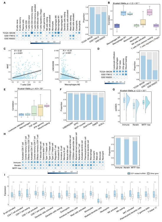 ICP-related lncRNAs are correlated with immune cell infiltration. (A) The heatmap shows the proportion of lncRNAs of which expression are significantly related with immune cell infiltration in each dataset calculated by CIBERSORT. The bar plot shows the number of lncRNAs whose expression is significantly related to immune cell infiltration as a proportion of the total number of all lncRNAs in each independent dataset. (B) The Spearman’s rank correlation coefficients between the expression of lncRNAs and immune cell infiltration. The box plots are shown as median (line), interquartile range (box), and data range. The Kruskal–Wallis test was used. (C) Examples of two lncRNAs closely related to immune cell infiltration. The fitting curve was performed with the lm function. Each blue dot represents correlation coefficient between ICP-related lncRNA expression and immune cell infiltration. The black line represents the fitting curve. The gray area represents confidence intervals. (D) The heatmap shows the proportion of lncRNAs whose expression is significantly related to immune expression signatures in each independent dataset. The bar plot shows the number of lncRNAs whose expression is significantly related to immune expression signatures as a proportion of the total number of all lncRNAs in each dataset. (E) The Spearman’s rank correlation coefficients between the expression of lncRNAs and immune expression signatures. The box plots are shown as median (line), interquartile range (box), and data range. The Kruskal–Wallis test was used. (F) The bar plot shows the number of lncRNAs whose expression is significantly correlated with immune cell infiltration as a proportion of the total number of all lncRNAs. The level of immune cell infiltration was calculated by different algorithms. (G) The raincloud plot shows ssGSEA scores with lncRNAs and ICPs in ‘immune’, ‘keratin’, and ‘MITF-low’ clusters of SKCM. The Kruskal–Wallis test was used. (H) The heatmap shows the proportion of lncRNAs whose expression is significantly related to immune cell infiltration in each subtype calculated by ssGSEA. The bar plot shows the number of whose expression is significantly related to immune cell infiltration as a proportion of the total number of all lncRNAs in each subtype. (I) Expression of ICP-related lncRNAs and other genes in immune cell lines. The Wilcoxon Mann–Whitney test was used. *** p < 0.001.