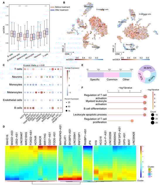 ICP-related lncRNAs showed specific features across immune cell subsets based on single-cell RNA sequencing. (A) ssGSEA scores of lncRNAs in melanoma before and after immunotherapy. The box plots are shown as median (line), interquartile range (box), and data range. The Wilcoxon Mann–Whitney test was used. **** p < 0.0001. (B) tSNE plots of cells in melanoma before and after immunotherapy, color-coded by ssGSEA scores for lncRNAs. (C) The dot plot shows ICP-related lncRNAs expression in different cell types. The Kruskal–Wallis test was used. (D) The heatmap shows pseudotime of ICP-related lncRNAs in melanoma. (E) The bar plot and chart show the percentage of lncRNA-gene pairs with different patterns. (F) The plot shows the pathways involved in specific pattern pairs. **** p < 0.0001.