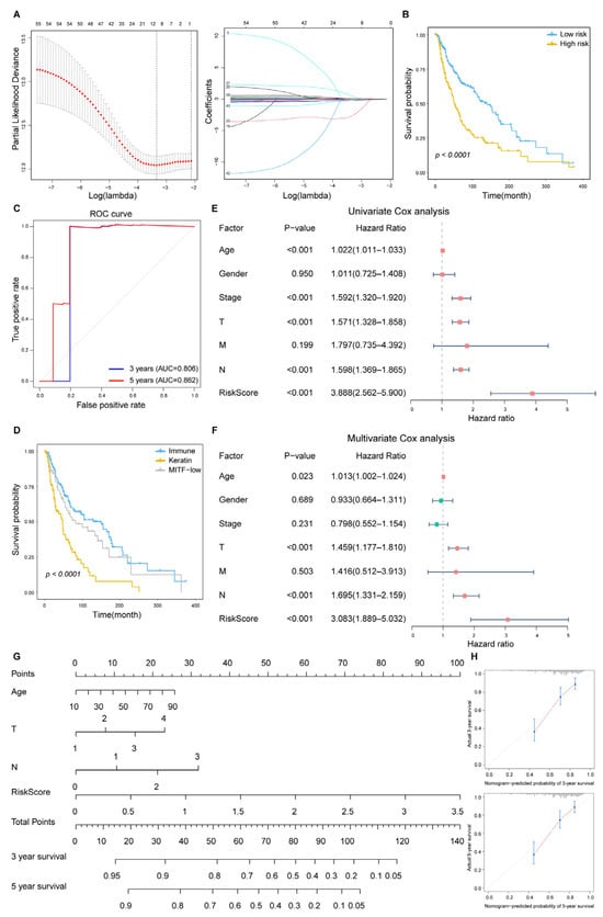 Several ICP-related lncRNAs are associated with survival in melanoma patients. (A) Left, ten-time cross-validation for tuning parameter selection in the LASSO model. Right, LASSO coefficient profiles. (B) Kaplan–Meier survival analysis of OS for patients with high (yellow) and low (blue) risk scores. The survival difference is calculated by the log-rank test. (C) ROC curves for 3-year and 5-year OS prediction of ICP-related lncRNAs were performed in TCGA SKCM. (D) Kaplan–Meier survival analysis of OS in ‘immune’ (blue), ‘keratin’ (yellow), and ‘MITF-low’ (grey) clusters of SKCM. (E,F) Forest plots of univariate and multiple Cox regression analyses. Each horizontal line indicates a 95% confidence interval. The dashed line is the null line, indicating OR = 1. Squares indicate point estimates. Red squares represent OR > 1 and green squares represent OR < 1. (G) Nomogram to estimate the prognostic risk of ICP-related lncRNAs. Each variable axis corresponds to the characteristic attribute score of a single sample. The likelihood of 3-year and 5-year OS is determined on the survival axis. (H) The calibration curves show the predictive capability of ICP-related lncRNAs. The X-axis represents the predicted value of survival probability and the y-axis represent actual survival possibility.