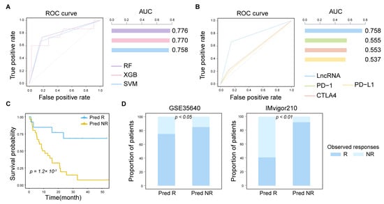 A few ICP-related lncRNAs could improve the prediction of immunotherapy response in melanoma patients. (A) ROC curves of three machine learning algorithms constructed using ICP-related lncRNAs to predict ICI response. (B) Comparison of the ability of ICP-related lncRNAs to predict ICI response with that of other clinical biomarkers. (C) Kaplan–Meier survival analysis of OS in melanoma patients for responders (blue) and non-responders (yellow). The survival difference is calculated by the log-rank test. (D) Immunotherapy-response prediction using the expression levels of ICP-related lncRNAs. Predicted responders (Pred R) and non-responders (Pred NR) are plotted against observed responders (blue) and non-responders (light blue). The two-sided Fisher’s exact test was used to compute statistical significance.