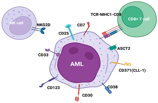 Unfortunately, compared to lymphoid diseases, AML is genetically more heterogeneous and the driver oncogenic lesions vary within and among patients [75]. Furthermore, the AML mutational burden, thus the generation of new potential leukemia-specific antigens, is fifty times lower compared to solid tumors, and new proteins resulting from chromosomal translocations or from gene mutations during leukemogenesis are poorly immunogenic or not expressed on cell surface [75,76]. With this limitation, clinical studies focused on CD33, CD123, and CD371 (CLL-1/Cec12), which show sufficient differential expression on AML and hematopoietic cells, and other potential targets, such as CD38, FLT3, CD56, CD30, CD7, and CD25, are under investigation (Figure 3).