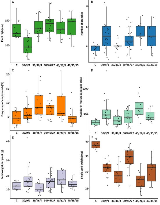 - Hornyák, M.; Słomka, A.; Sychta, K.; Dziurka, M.; Kopeć, P.; Pastuszak, J.; Szczerba, A.; Płażek, A. Reducing flower competition for assimilates by half results in higher yield of Fagopyrum esculentum. Int. J. Mol. Sci. 2020, 21, 8953. [Google Scholar] [CrossRef]