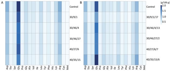| Amino Acid | Control | 30/9/1/17 | 30/46/4/13 | 30/46/27/2 | 40/27/6/7 | 40/35/15/6 | LSD |