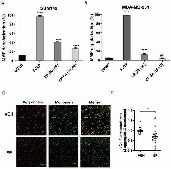 EP significantly reduced MMP potential in TNBC cell lines (SUM-149 and MDA-MB-231) compared to controls (Figure 1A,B). The positive control trifluoromethoxy carbonylcyanide phenylhydrazone (FCCP) decoupled the mitochondria, resulting in MMP collapse in around 100% of the TNBC cell lines. We also tested the effect of an EP derivative, EP-SA [], which only produced a significant effect in SUM-149 cells (Figure 1A). The reduction in MMP in MDA-MB-231 cells treated with EP was confirmed with the JC-1 assay. EP treatment significantly (p < 0.05) decreased the J-aggregates to the J-monomers ratio in these cells (Figure 1C,D). This ratio is directly correlated to the polarization of the mitochondrial membrane, indicating a disruption in MMP following the administration of EP. Together, these results indicate that EP treatment depolarizes the mitochondrial membrane, which is a key feature of the selective properties of EP.