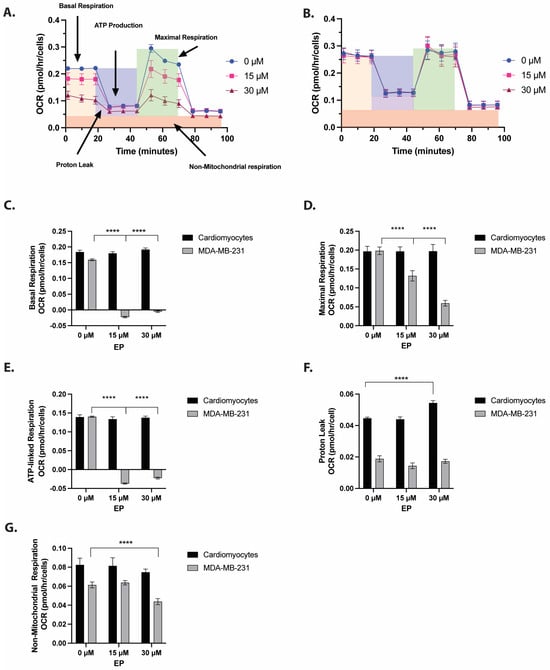 Mitochondrial metabolism has emerged as a viable target for cancer therapy. The anti-tumor effects of agents that inhibit mitochondrial bioenergetic capacity stem from disruptions in the electron transport chain []. To investigate the effects of EP on mitochondrial metabolism, we measured the oxygen consumption rate (OCR) of TNBC cells. Cardiomyocytes, differentiated from human pluripotent stem cells, were used as a non-cancerous control. These cells were specifically chosen as controls for their high mitochondrial content [] (Figure 2A,B). We found that the basal OCR in MDA-MB-231 TNBC cells decreased significantly (p < 0.0001) in response to the 15 µM and 30 µM EP doses (Figure 2C). A mitochondrial stress test using oligomycin (mitochondrial complex V inhibitor) confirmed that this effect was limited to TNBC cells (Figure 2D). ATP production and maximum respiration significantly decreased in EP-treated cells (Figure 2E). Proton leak was not affected in the cancer cells and was slightly increased at 30 µM EP in cardiomyocytes (Figure 2F). It is possible that at this higher concentration (IC50 = 20 mM in 72 h) and shorter duration, EP does not kill the cardiomyocytes but instead causes a non-lethal increase in proton leak.