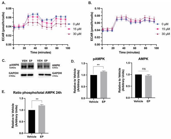 EP decreases glycolysis in TNBC cells: (A) MDA-MB-231 TNBC cells or (B) cardiomyocytes differentiated from human-induced pluripotent stem cells were treated with 0–30 µM EP for 24 h. ECAR was affected by EP at 30 μM only in cancer cells. A two-way ANOVA with Bonferroni’s multiple comparison test was performed. (C) Immunoblots of MDA-MB-231 cells treated with vehicle or 20 µM EP for 24 h. Tumor lysates were probed for the indicated proteins. (D,E) Densitometry quantification analysis of total and phospho-proteins; the intensities were normalized to its loading control and plotted. A two-tailed unpaired t-test was performed; ** p < 0.01, ns: not significant. Results are shown as Mean ± SEM of three independent experiments.