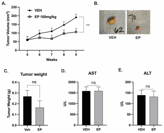 In the first experiment evaluating tumor volume (Figure 4), mice were treated with intraperitoneal injections of either vehicle (2% Tween 80, 2% ethanol) or EP (100 mg/kg body weight (BW)) every three days for 9 weeks. Mice were weighed once a week, and tumor volume was measured twice a week with precision calipers. By week 9, we identified a significant treatment effect (p < 0.002), indicating a decrease in tumor volume in mice treated with EP compared to those treated with the vehicle (Figure 4A). Tumors in EP-treated mice were generally smaller, and 25% of these mice had no detectable tumors by the end of the study (Figure 4B). However, the results for tumor weight did not reach significance (Figure 4C). Body weight was not affected by EP treatment [].