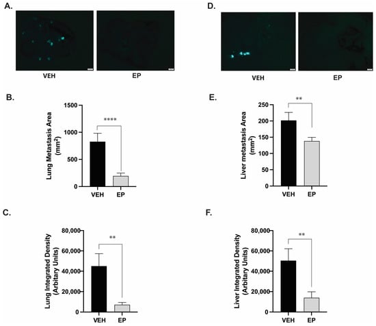 Ventral and dorsal images of each organ were used to quantify the metastatic foci. ImageJ was used to quantify the area, which represents the lesion size, and integrated density, which represents the number of cells present in each metastatic foci. EP treatment resulted in a significant (76%) reduction in the lung metastasis area, indicating a reduced lesion size (Figure 5A,B). EP also decreased the number of TNBC cells residing in lung metastatic foci by 84% (represented by integrated density) (Figure 5C) []. We found similar results in the liver. EP significantly reduced metastasis to the liver compared to the vehicle group (Figure 5D) with a 30% decrease in the liver lesion size (Figure 5E) and a 72% reduction in the number of metastatic TNBC cells present in the liver metastatic foci (Figure 5F).