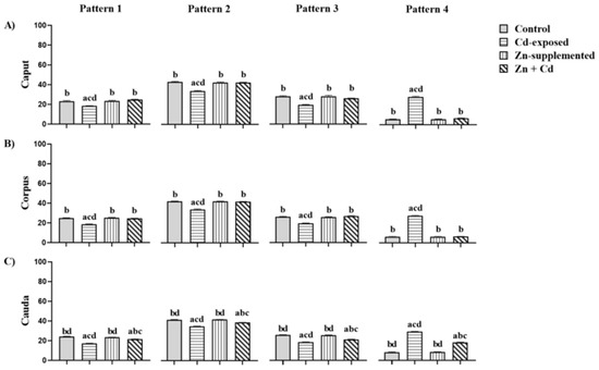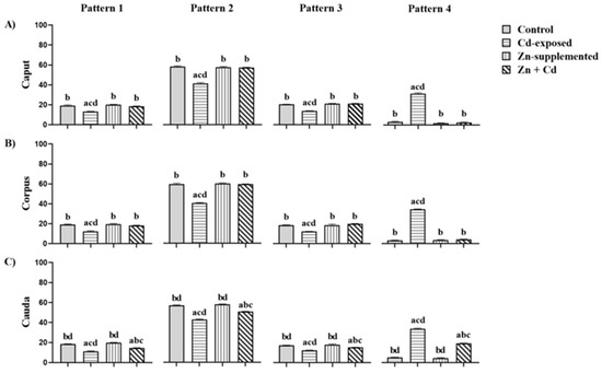 | Length (µm) | caput | 31 ± 0.30 b | 37 ± 0.62 acd | 30 ± 0.14 b | 29 ± 0.66 b |