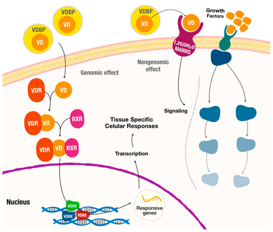 For the genomic pathways (Figure 1), vitamin D binds to the vitamin D receptor (VDR), which acts as a transcription factor by forming a heterodimer with the retinoid X receptor (RXR). The VDR/RXR complex then translocates to the nucleus and binds to specific nucleotide sequences in DNA (also known as VDRE, vitamin D response elements) to modulate the expression of a substantial number of target genes (about 5–10% of the total human genome). In addition, vitamin D induces rapid non-genomic cellular responses by binding to a membrane receptor, called the membrane-associated rapid response steroid (MARRS), to regulate several intracellular processes (calcium transport, mitochondrial function, ion channel activity, etc.) [5,11,12,22,23].