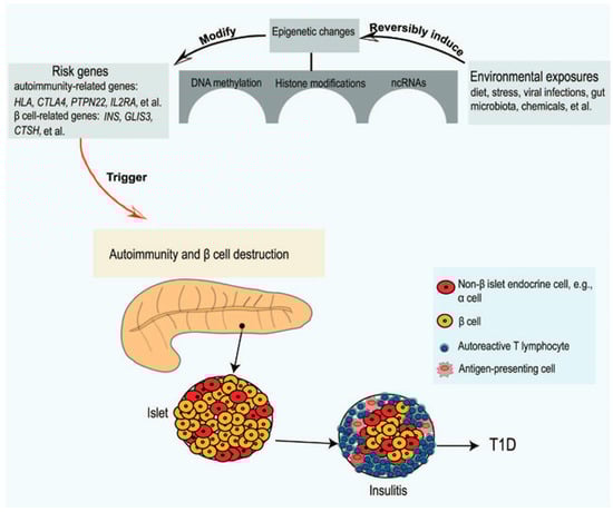 Environmental exposures induce epigenetic changes in genetically predisposed subjects to trigger the autoimmune destruction of the pancreatic β-cells (adapted from [28]).