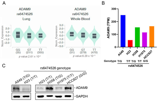 The effects of ADAM9 rs6474526 polymorphisms on ADAM9 expression were evaluated using validated datasets from the Genotype-Tissue Expression (GTEx) portal (https://gtexportal.org/home/, accessed on 12 Dec 2024) and the DepMap portal (https://depmap.org/portal/, accessed on 16 Jan 2025). (A) Violin plots show that the G allele of rs6474526 was associated with higher ADAM9 expression in lung tissues and whole blood. The Y-axis represents normalized ADAM9 gene expression levels (Norm. Expression), which have been adjusted to minimize technical and biological variation, allowing accurate comparison across different genotypes. The p-value on the X-axis indicates the level of statistical significance for the association between the rs6474526 SNP and ADAM9 expression. (B) Relationships between ADAM9 rs6474526 genotypes and ADAM9 expression levels were analyzed in five lung adenocarcinoma (LUAD) cell lines. The lower panel shows genotypes of ADAM9 rs6474526 in LUAD cells (A549, H23, H358, H1975, and HCC827), determined using a TaqMan SNP Genotyping Assay, while the upper panel presents ADAM9 mRNA expression levels obtained from the DepMap portal. (C) The ADAM9 protein expression levels were analyzed by the Western blot assay in LUAD cells carrying the wild-type or mutant genotype of ADAM9 rs6474526.