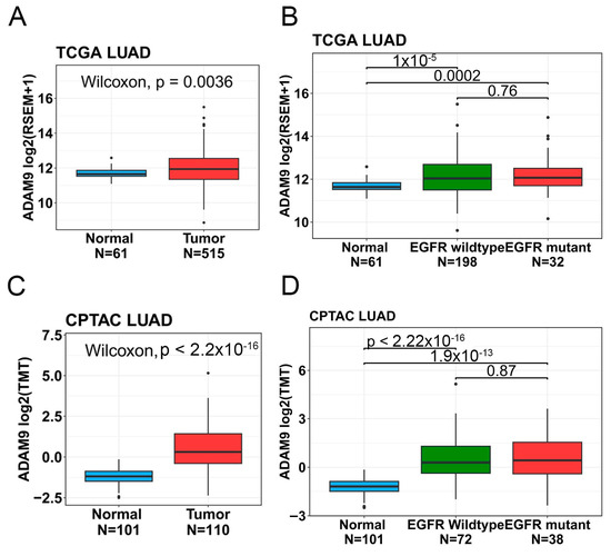 ADAM9 mRNA and protein expression levels in lung adenocarcinoma (LUAD) patients were, respectively, analyzed using data from TCGA and CPTAC databases. (A,C) ADAM9 mRNA (A) and protein (C) levels were compared between normal and tumor tissues from LUAD patients. (B,D) LUAD tissues, regardless of the EGFR status (wild-type or mutant), showed significantly elevated ADAM9 mRNA (B) and protein (D) levels compared to normal tissues. For multiple group comparisons, brackets have been used to indicate which groups are being compared, with p < 0.05 considered significant.