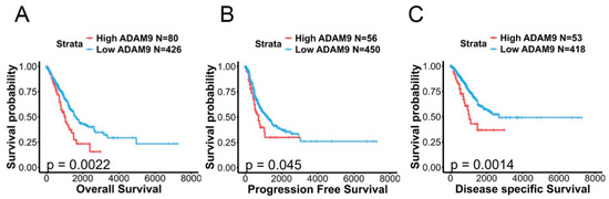 The prognostic impact of ADAM9 expression on lung adenocarcinoma (LUAD) patients was analyzed. (A–C) Kaplan–Meier survival curves depict overall survival (A), progression-free survival (B), and disease-specific survival (C) in LUAD patients, categorized by high or low ADAM9 expression levels. The p-value expresses the statistical comparison between patients with high and low ADAM9 expression. A log-rank test p-value < 0.05 is considered significant. The LUAD dataset was retrieved from TCGA.