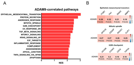 Pathways associated with ADAM9 in lung adenocarcinoma (LUAD) patients were analyzed. (A) A horizontal bar plot displays ADAM9-related pathways, with red bars representing pathways positively correlated with ADAM9 expression. The X-axis shows the normalized enrichment scores (NESs), and the Y-axis lists the pathways identified from the Hallmark database. (B) Correlation plots illustrate the relationship between ADAM9 expression and biomarkers of the epithelial–mesenchymal transition, mitotic spindle, and G2M progression. RNA-sequencing data from The Cancer Genome Atlas-LUAD dataset were used for analysis. A Pearson correlation analysis identified these associations, with correlation coefficients and p-values provided for each square. The scale bar reflects the strength of the correlation.