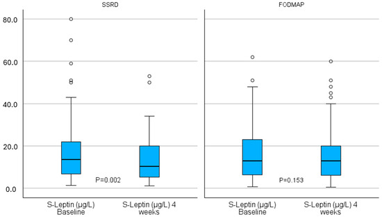 Leptin concentrations at baseline and 4 weeks, stratified by group. SSRD = starch- and sucrose-reduced diet. Low FODMAP = low content of fermentable oligo-, di-, and monosaccharides and polyols. Boxplot of leptin concentrations at baseline and 4 weeks. Wilcoxon signed ranks. p < 0.05 was considered statistically significant.
