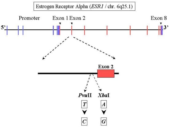 - Zhang, Y.; Zhang, M.; Yuan, X.; Zhang, Z.; Zhang, P.; Chao, H.; Jiang, L.; Jiang, J. Association Between ESR1 PvuII, XbaI, and P325P Polymorphisms andBreast Cancer Susceptibility: A Meta-Analysis. Med. Sci Monit. 2015, 21, 2986–2996. [Google Scholar] [CrossRef]