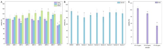 (A) Viability of FaDu (violet), Cal-33 (blue), and hMSCs (green) after 24 h treatment with SBR extracts. (B) Viability of Cal-33 after treatment with SBR 8 and its fractions, obtained through column chromatography. (C) Viability of FaDu after 24 h treatment with different concentrations of Paclitaxel (PTX). Mean ± SD with n = 6, * p < 0.05, ** p < 0.01, *** p < 0.001.