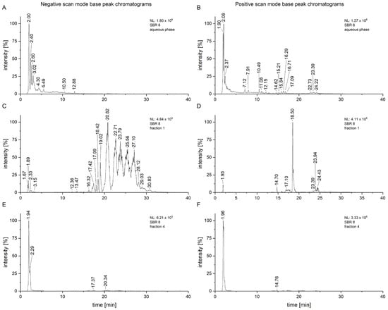 Negative- and positive-scan-mode chromatograms of the aqueous phase of SBR 8 (A,B) and its fractions 1 (C,D) and 4 (E,F).