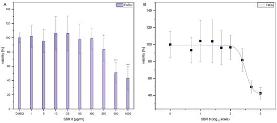 (A) MTS assay results after 24 h treatment of FaDu with different concentrations of SBR 8. (B) MTS assay results after 24 h treatment of FaDu with different concentrations of SBR 8, plotted on a logarithmic scale for LD50 determination. Mean ± SD with n = 6, * p < 0.05, *** p < 0.001.