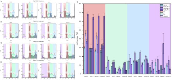 Cell cycle analyses were performed to validate the MTS assay results. Figure 4A–D show histogram examples of Cal-33 (A) and FaDu (B, C, and D for 24, 48, and 72 h, respectively) treated with DMSO, SBR 8 fraction 1, and SBR and fraction 4. Figure 4E presents the cell cycle distribution. Cells treated with SBR 8 and its fractions were compared to cells treated with DMSO.