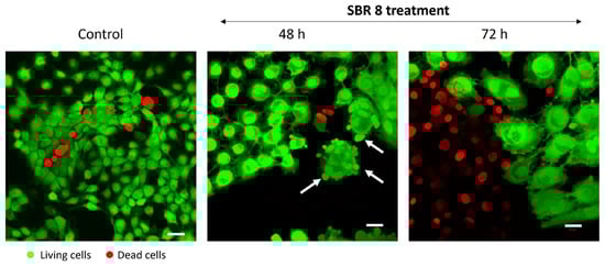 Live/dead cell staining using a green fluorophore to label viable cells and a red probe to indicate non-viable cells. Under control conditions, Cal-33 cells show a minimal presence of dead cells. In contrast, treatment with SBR 8 leads to a significant increase in apoptotic cells after 72 h. Signs of apoptosis, including membrane blebbing (indicated by white arrows) and swollen cell bodies, are already apparent after 48 h of treatment. The white scale bar represents 20 µm.
