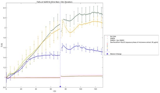 Electric cell–substrate impedance (ECIS) measurements were conducted using an ECIS® Z-Theta 96 Well Array Station with a 96W20idf PET well plate (Applied BioPhysics, Inc., Troy, NY, USA). ECIS software (version 1.2.186.0 PC, Applied BioPhysics, Inc., Troy, NY, USA) was used to operate the device and analyze the results. FaDu cells were seeded in the well plate and incubated with 200 µL of DMEM until a constant impedance signal was reached (approximately 2 days). Then, 100 µL of the medium was removed from each well except for the cell-free wells and 100 µL of fresh medium was added, in which the aqueous phase of the SBR 8 extract was dissolved, yielding a concentration of 50 µg/mL. As for the control, the cells were also treated with DMEM, as well as DMEM with 2 µL of DMSO. Their impedance (Z), capacity (C), and resistance (R) were measured at 9 frequencies (250, 500, 1000, 2000, 4000, 8000, 16,000, 32,000, and 64,000 Hz) over a period of 73 h. For the recovery experiment, the medium in the wells was removed completely and replaced with 200 µL of fresh medium. Measurements were carried out for an additional 48 h. Data were analyzed using ECIS software. A frequency analysis was performed and 16,000 Hz was chosen to as the frequency the impedance results would be viewed at.
