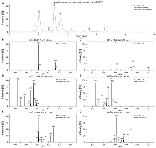 (A) Chromatogram of SBR 8’s aqueous phase, measured using Method B. (B,C) MS of peaks at 3.10 and 3.44 min. (D,E) MS2 spectra of parent ion at m/z 463. (F,G) MS2 spectra of parent ion at m/z 463.