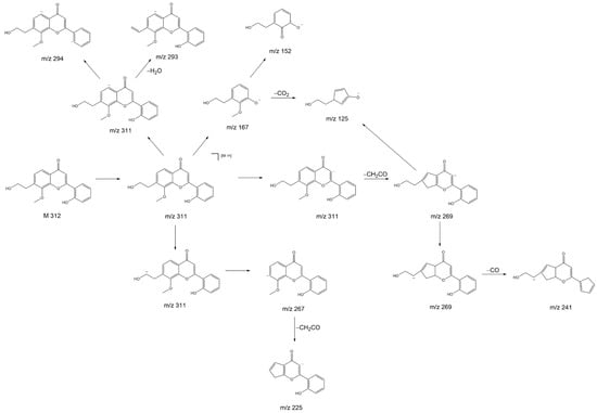 The product ion spectrum of the parent ion at m/z 311 shows particularly intensive fragment ion peaks at m/z 267 and m/z 125, which is typical for 2′-hydroxyflavonols []. We propose that the substance with the molecular ion peak at m/z 311 belongs to 7-(2-hydroxyethyl)-8-methoxy-2′-hydroxyflavone. Despite not being a hydroxyflavonol, the substance has a very similar structure to a 2′-hydroxyflavonol. The proposed fragmentation of 7-(2-hydroxyethyl)-8-methoxy-2′-hydroxyflavone is displayed Figure 8 as an example of a substance which could yield the fragments observed in Figure 7D,E. It is noteworthy that we see two peaks with slightly different retention times and nearly identical fragmentation patterns in Figure 7. This indicates the presence of very structurally similar substances that contain only a slight difference, e.g., in their methoxy group placement.