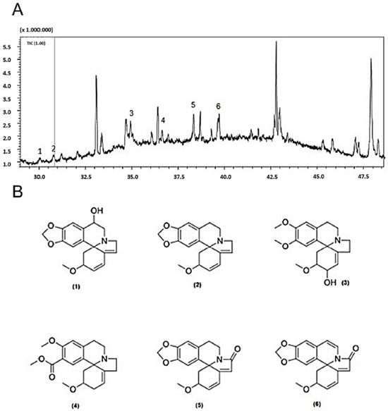 (A) Amplification of the chromatogram (CG-MS) of E. velutina extract. (B) 2D structures of the alkaloids identified by CG-MS in the E. velutina extract sample. (1): Erythrinine; (2): Erythraline; (3): Erythratidine; (4): Erythroculin; (5): Cristamidine; (6): Oxoerythraline.