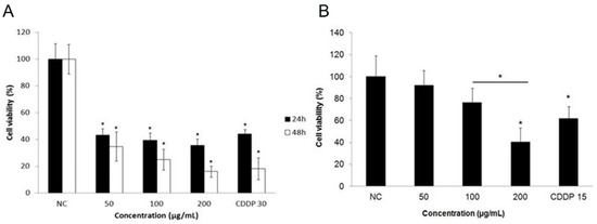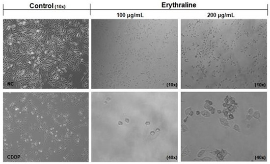(A) Cells were treated with 50, 100, and 200 μg/mL erythraline and cisplatin (CDDP) for 24 h and 48 h and in (B) PBMC cells for 24 h. NC, control. * p < 0.05.