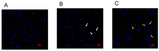 Fluorescence microscopy of cells treated with erythraline and stained with DAPI after 48 h of treatment in (A) control, (B) cisplatin 30 μg/mL, and (C) erythraline 50 μg/mL. White arrows indicate nuclear fragmentation and apoptotic bodies. Yellow arrows indicate nuclear retraction and chromatin condensation.