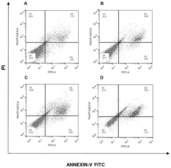Flow cytometric of apoptosis analysis of SiHa cells treated with isolated erythraline or associated with z-VAD (100 μM). In (A) untreated cells; (B) cells with z-VAD (100 μM) addition; in (C) cells treated with erythraline; and in (D) treatment with the erythraline associated with z-VAD.